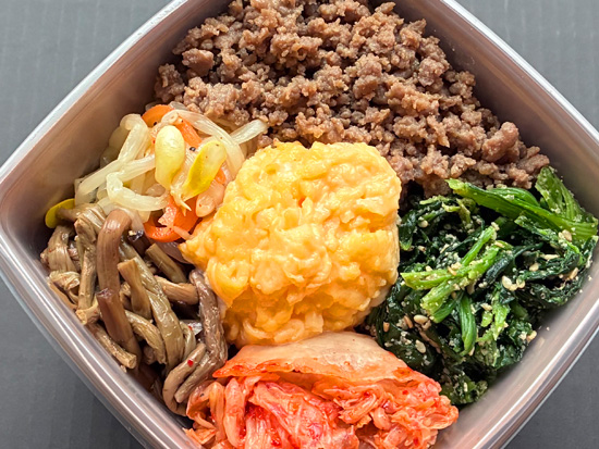 ビビンバと三色そぼろの日韓いいとこ取り。野菜たっぷりでヘルシー、ピリ辛お肉で大満足。栄養バランスも◎な“完全メシ”。